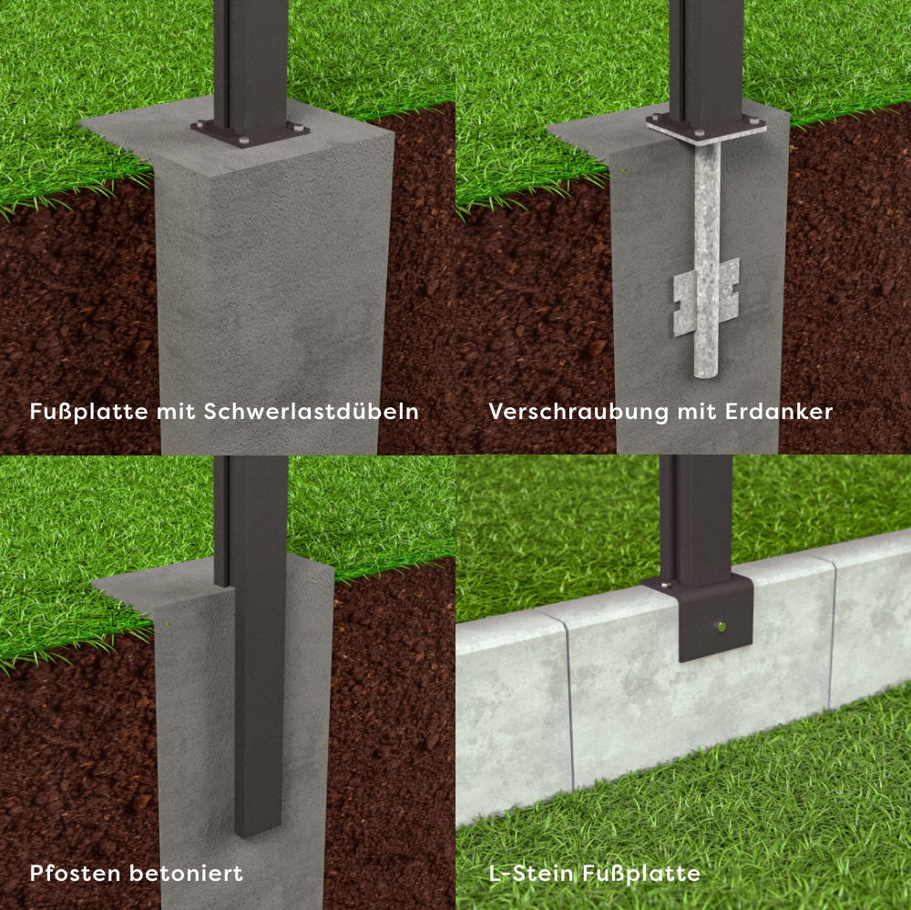 - 1 x Hochwertiger Aluminium-Pfosten inkl. Pfostenträger und Abdeckkappe