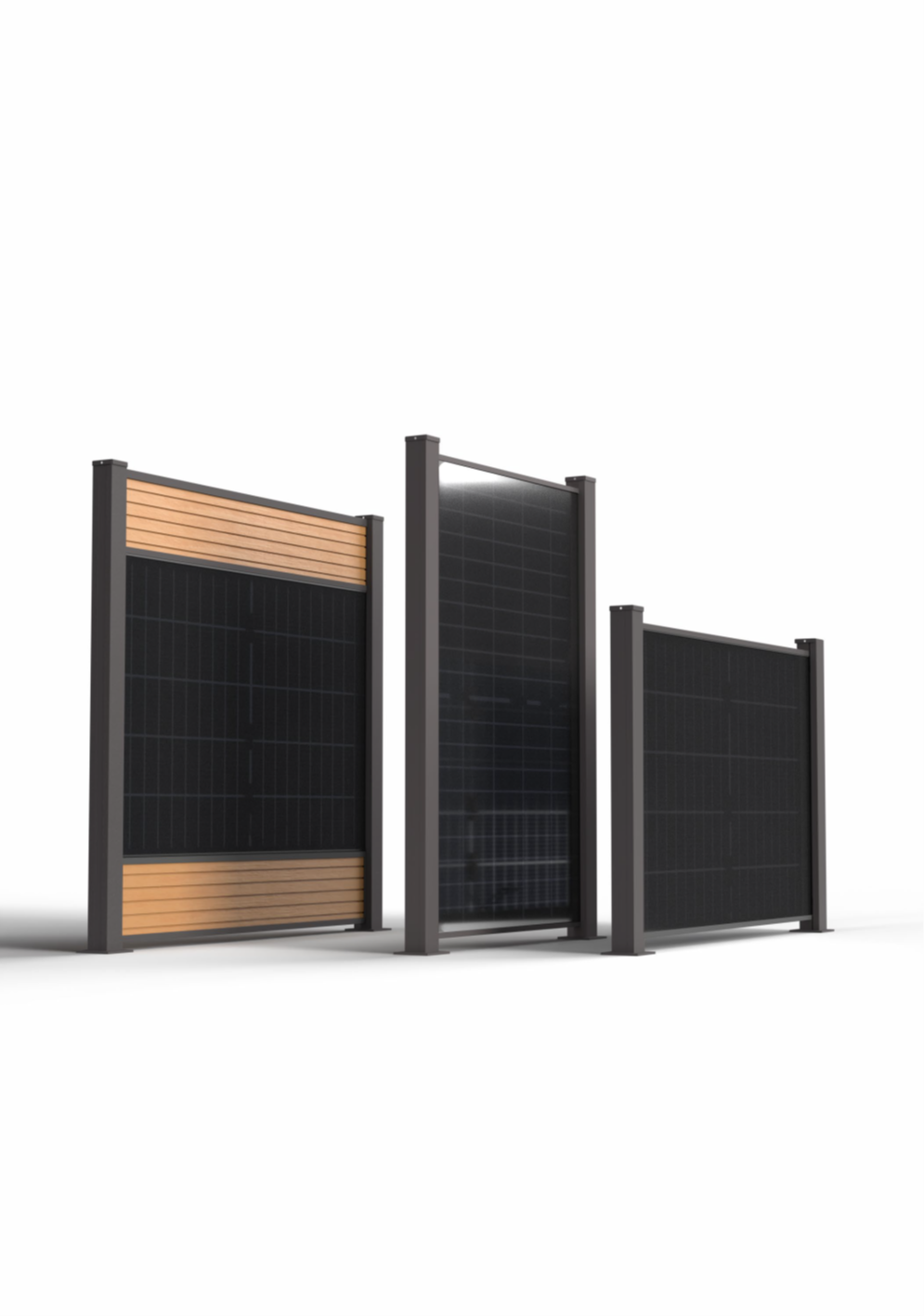 Je nach gewählter Zaunserie wird der Bereich zwischen den Zaunpfosten mit einem bifazialen Photovoltaik-Modul, Befestigungsleisten und WPC- oder Aluminiumprofilen gefüllt