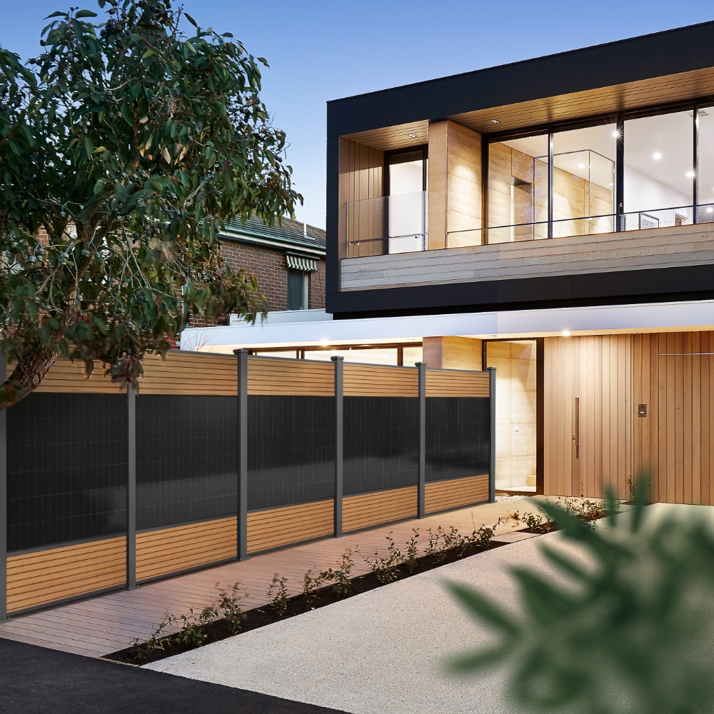 Die WPC Profile verdanken ihre Eleganz und Feinheit der modernen Rhombus Optik. Das Profil verleiht dem Zaun einen trendigen Look, der auch perfekt mit dem Solarmodul harmoniert.